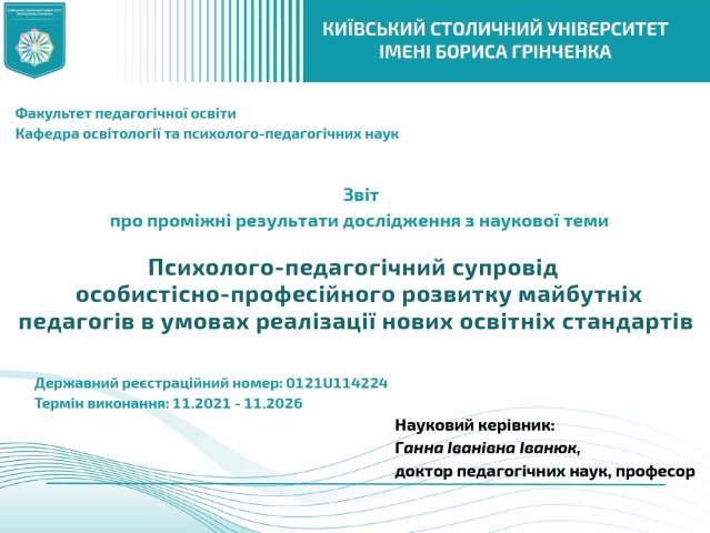 On September 25, 2025, at a meeting of the Academic Council at Borys Grinchenko Kyiv Metropolitan University, an interim report was approved on the implementation of the research project of the Department of Educology and Psychological and Pedagogical Sciences of the Faculty of Pedagogical Education “Psychological and Pedagogical Support for the Personal and Professional Development of Future Teachers in the Context of the Implementation of New Educational Standards” (registration number: 0121U114224; implementation period: November 2021 – November 2026).